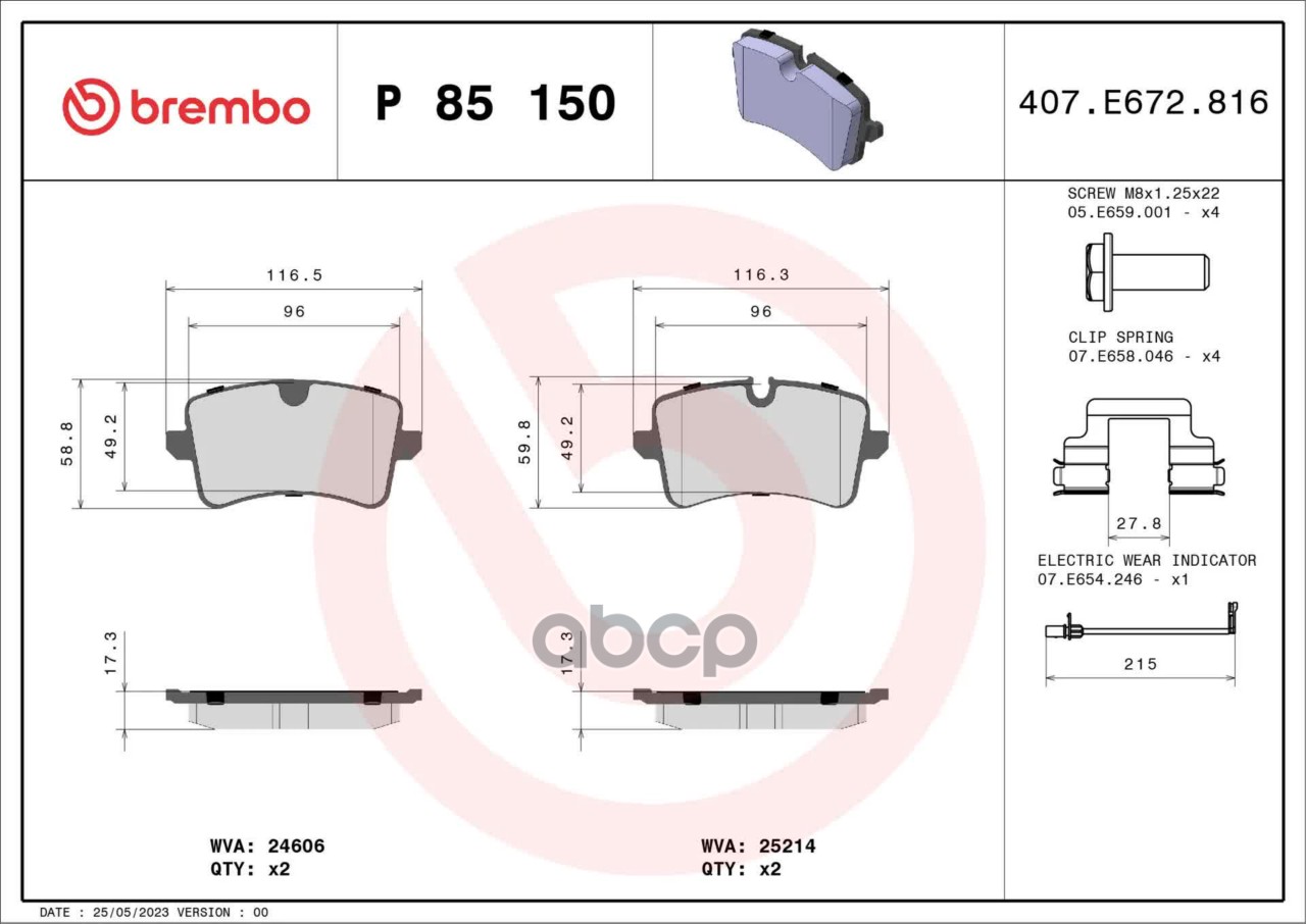 Наименование: P85150 BREMBO Колодки тормозные AUDI A6 11-/A7 10- задние с датч.