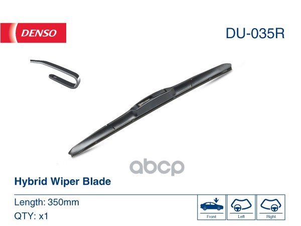 Бренд: Denso, артикул: DU035R, Щетка стеклоочистителя "Hybrid" 350mm ALFA ROMEO/AUDI/BMW/CEVROLET/CITROEN/DAEWOO/FERRARI/FIAT/FORD/HONDA/HYUNDAI/KIA/LADA/LANCIA/MAZDA/MERCEDES/MITSUBISHI/NISSAN/OPEL/PEUGEOT/PONTIAC/PORCSHE/RENAULT/ROVER/SAAB/SEAT/SKODA/SUBARU/SUZUKI/TOYOTA/VOLVO/VW.