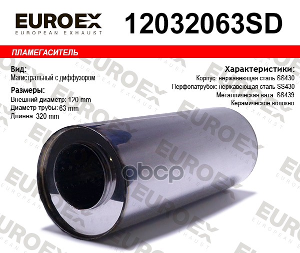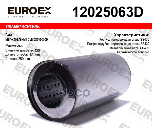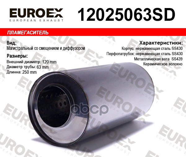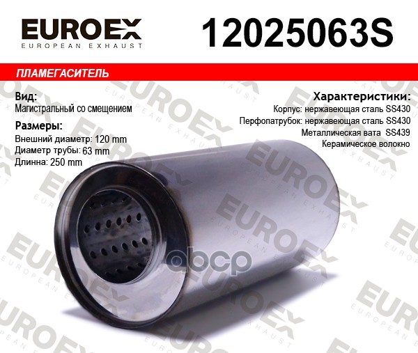 Пламегаситель магистральный со смещен. и диф. 120x250x63 нерж. (диаметр трубы 63
