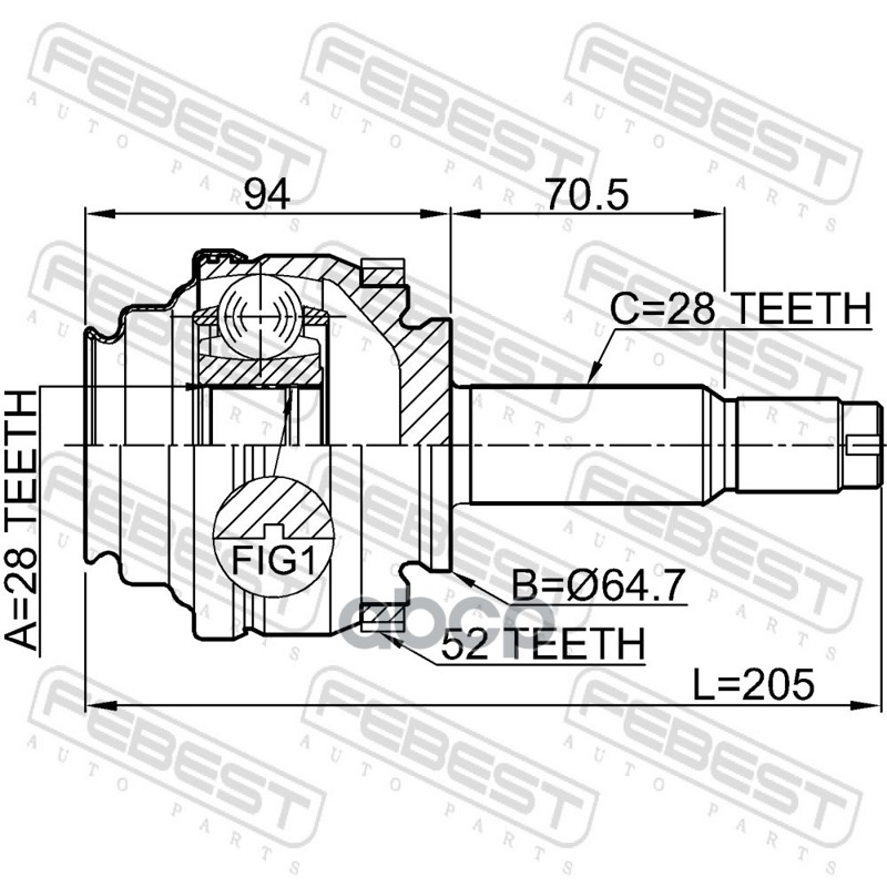 Бренд: Febest, артикул: 1410REXA52R, ШРУС НАРУЖНЫЙ ЗАДНИЙ 28X64.7X28. |