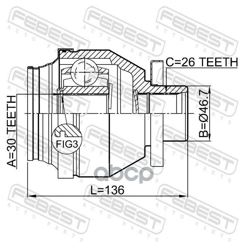 Бренд: Febest, артикул: 2311T5MTLH, ШРУС ВНУТРЕННИЙ 30X46.7X26 ШРУС внутренний 30х46,7х26 VOLKSWAGEN TRANSPORTERMULTIVAN T5 2311-T5MTL. |