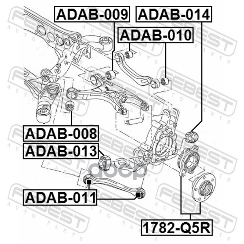 Бренд: Febest, артикул: ADAB-014, Сайлентблок задней цапфы Audi Q5 8RB 08/11- A6 10/11- A7 10/10- 8K0 505 431 AH, 8K0 505 432 AH, 8K0505431AH, 8K0505432AH, 8R0 505 431 C, 8R0 505 431 F, 8R0 505 432 C, 8R0 505 432 F, 8R0505431C, 8R0505431F, 8R0505432C, 8R0505432F, ADAB014. |