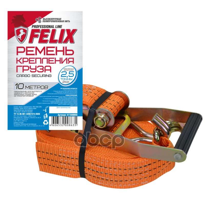 Ремень крепления груза с храповиком FELIX Длина - 10 м, Нагрузка - 2,5Тонн, Ширина - 50 мм, полиэстер, 2 металлических крюка