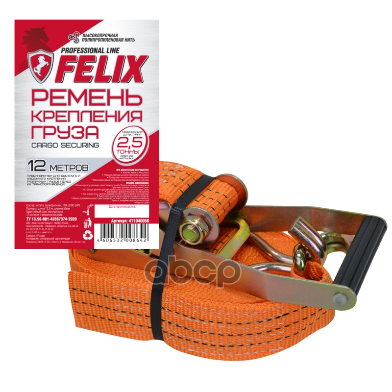 Ремень крепления груза с храповиком FELIX Длина - 12 м, Нагрузка - 2,5Тонн, Ширина - 50 мм, полиэстер, 2 металлических крюка
