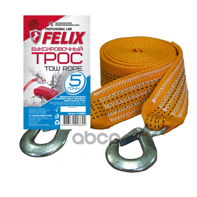 Трос буксировочный FELIX 6 Тонн, длина - 4,5 м, ленточный (полипропилен) 50 мм, 2-е металл. крюка
