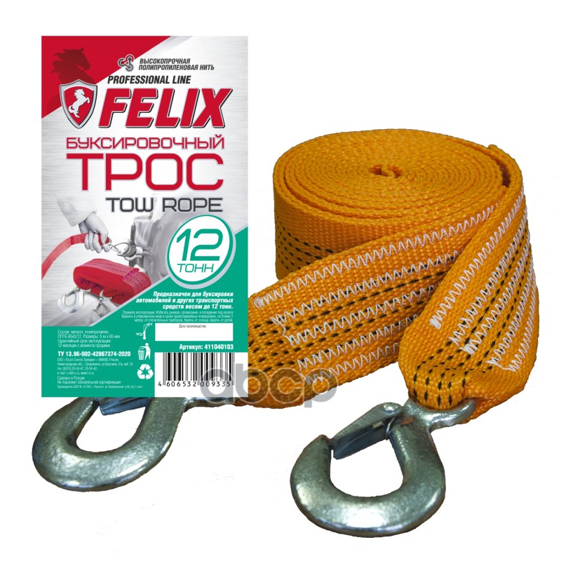 Трос буксировочный FELIX 12 Тонн, длина - 5 м, ленточный (полипропилен) 50 мм, 2-е металл. крюка