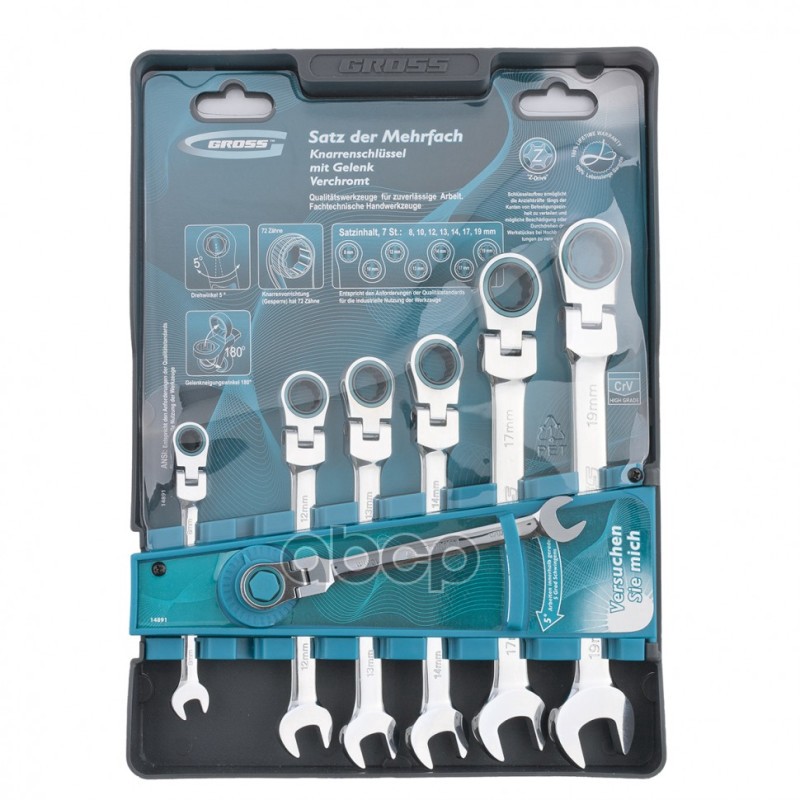 Наименование: Набор ключей комбинированных с трещоткой, 8 - 19 мм, 7шт., шарнирные, CrV