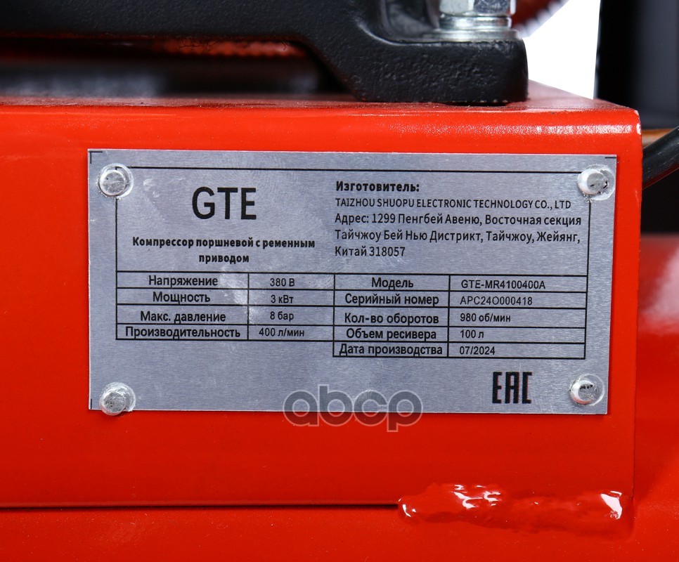 Наименование: Компрессор поршневой с ременным приводом 380В, ресив. 100л, 400лмин. GTE, GTE-MR4100400A
