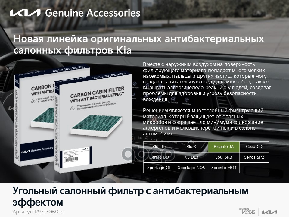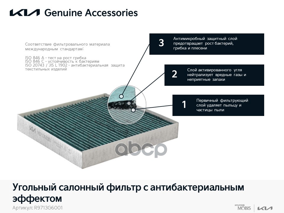 Бренд: Hyundai-KIA, артикул: R9713G6001, УГОЛЬНЫЙ САЛОННЫЙ ФИЛЬТР С АНТИБАКТЕРИАЛЬНЫМ ЭФФЕК. |