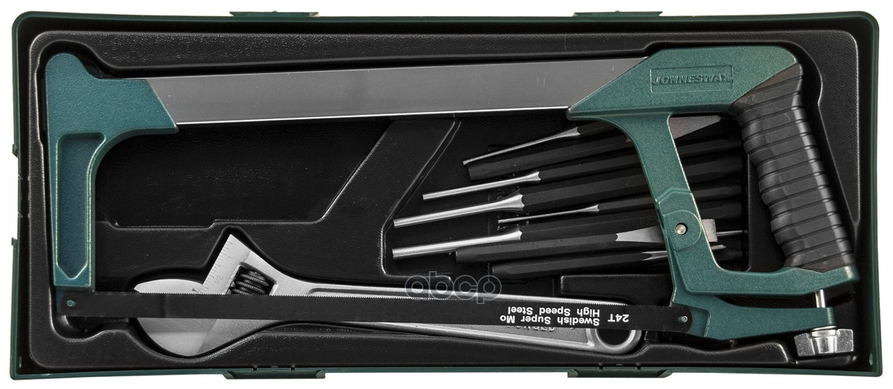 M645114SP Набор инструмента ножовка, разводной ключ, зубила и выколотки в ложементе, 14 предметов