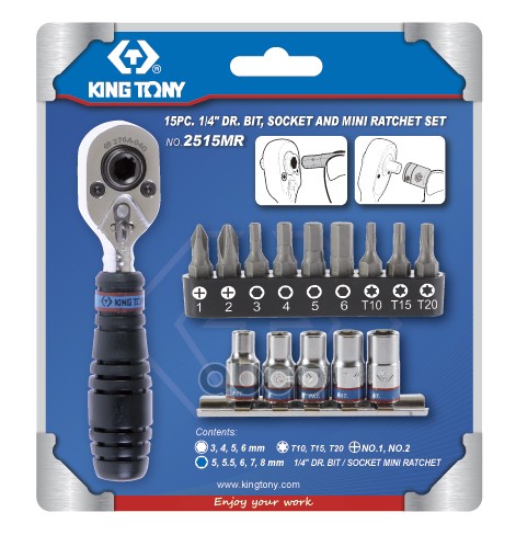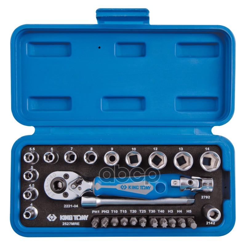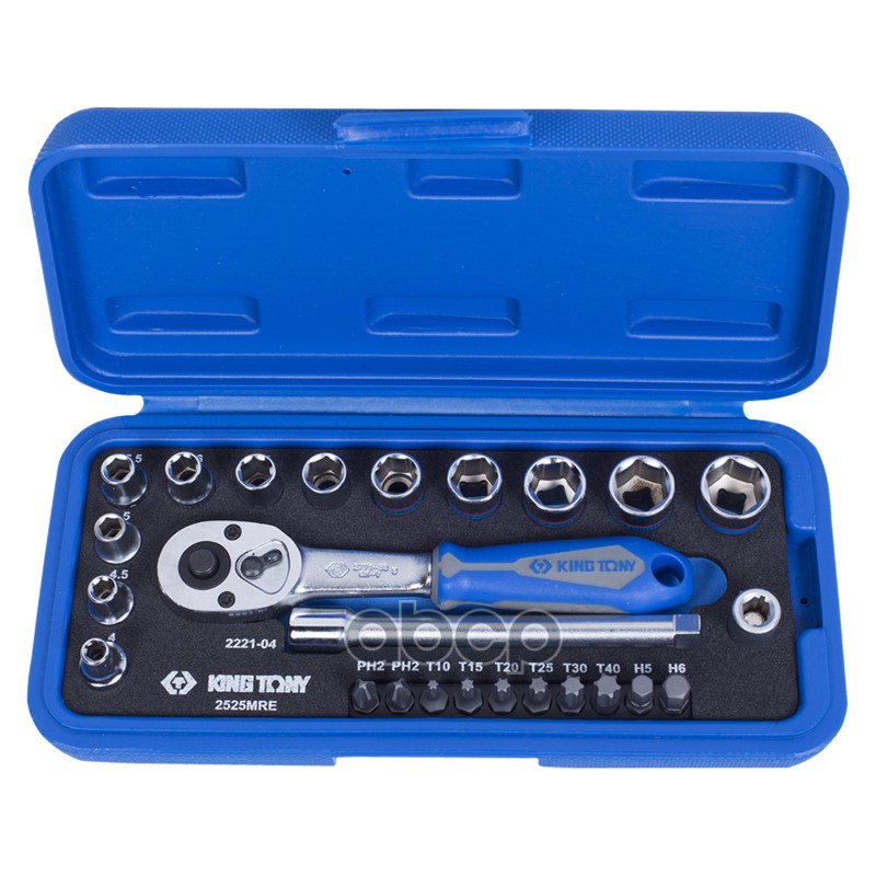 Набор торцевых головок с принадлежностями 1/4", шестигранные, 4-13 мм, 25 предметов KING TONY 2525MRE