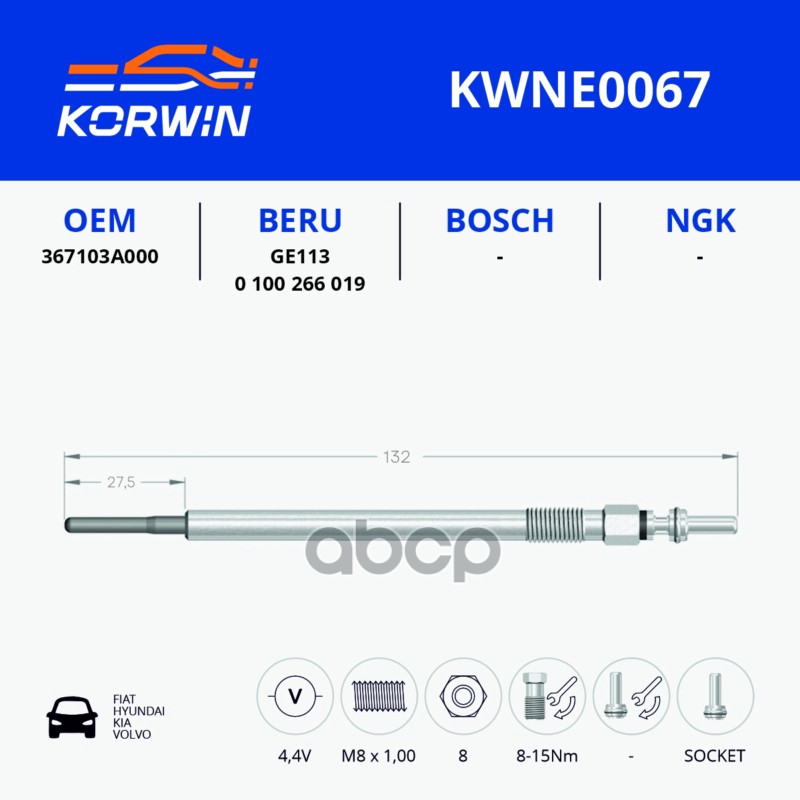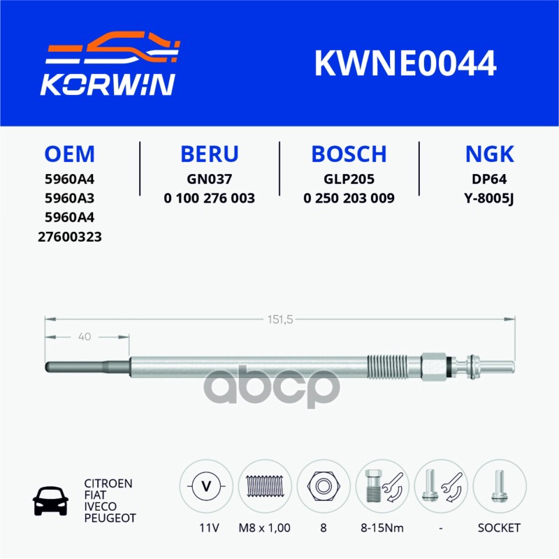 Свеча накаливания FIAT Ducato (Sollers-RUS) (99-) 2.3JTD пр.Турция_KORWIN 5802219038 F002G50048;5802219038;500351992;5802219038;5960K4;5960A3;