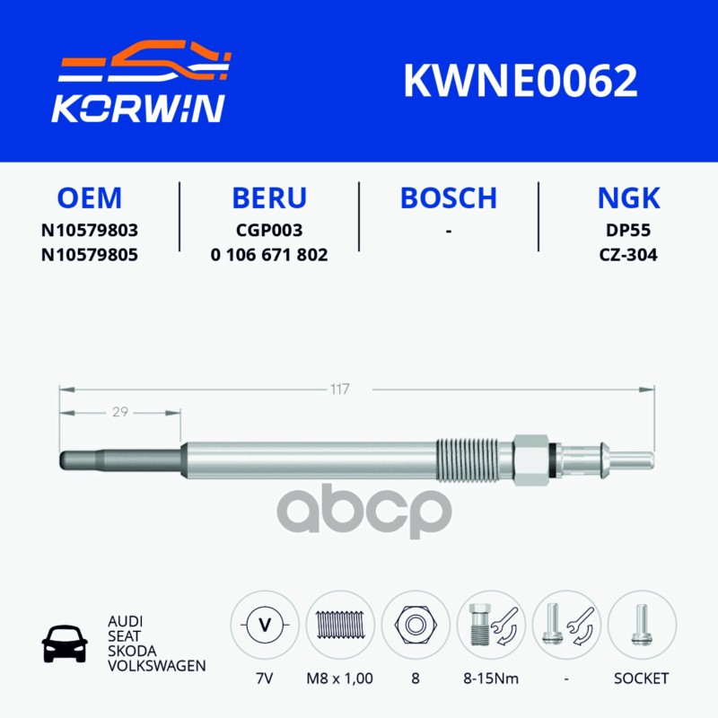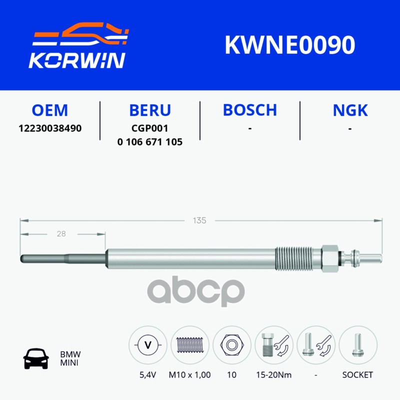 Свеча накаливания BMW 3/5/X3/X5 E60/E70/E83/E90 (06-) 2.0D/2.5D/3.0D пр.Турция_KORWIN 12 23 2 248 059 12232248059;12237786869;0250202103;