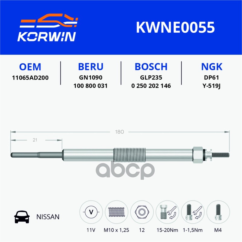 Свеча накаливания Nissan X-Trail (01-)/Pathfinder (05-) 2.2DCi/2.5DCi пр.Турция_KORWIN 11065-AD220 11065AD220;11065AD20A;11065AD201;11065AD200;