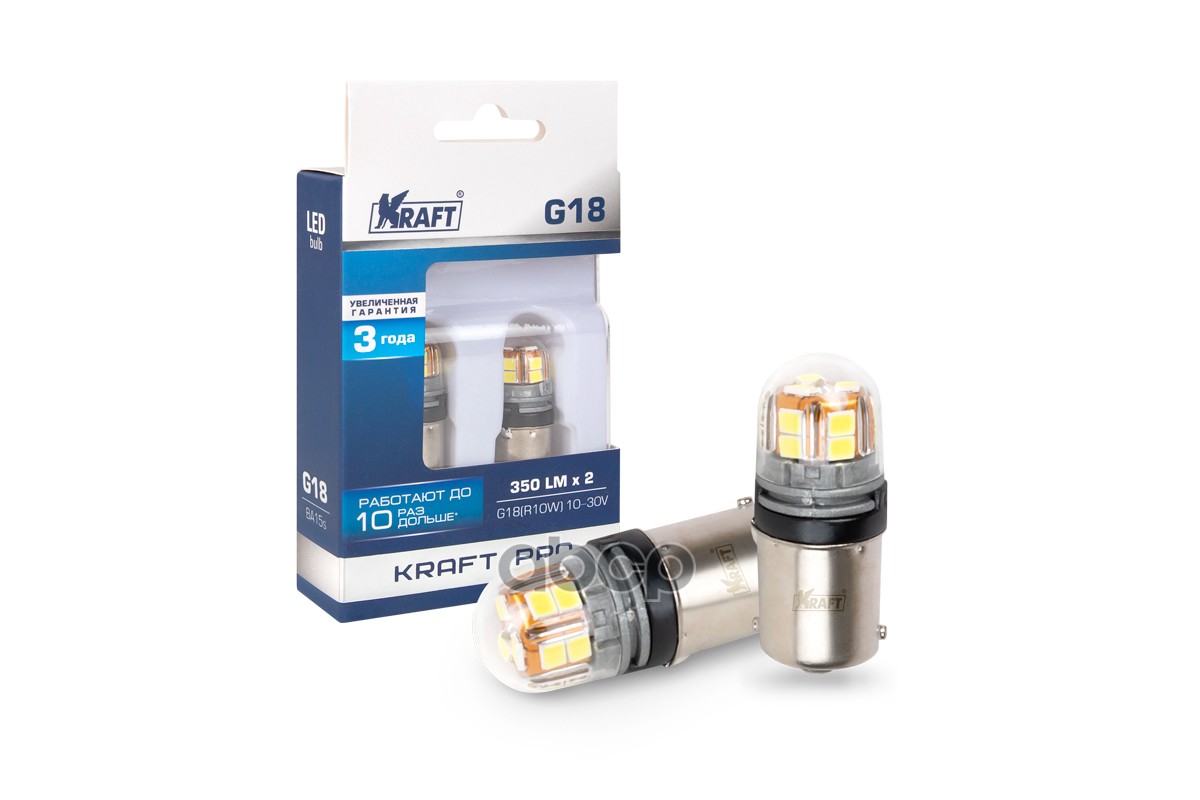 Наименование: Светодиод G18 R10W (BA15s) 10-30v (white) Kraft Pro (2 шт. Европодвес) KT700265