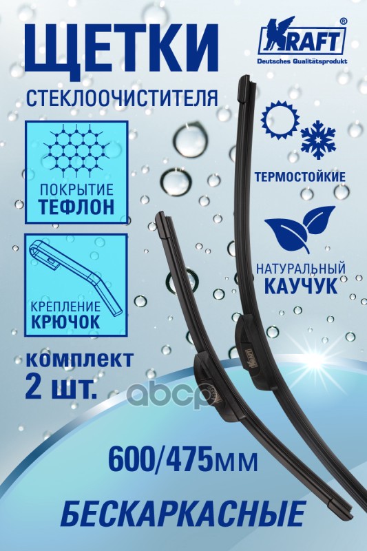 Бренд: Kraft, артикул: KT830922, К-т бeскаркасных щеток стеклоочистителя TEFLON 600/475 ММ, 1 адаптер.