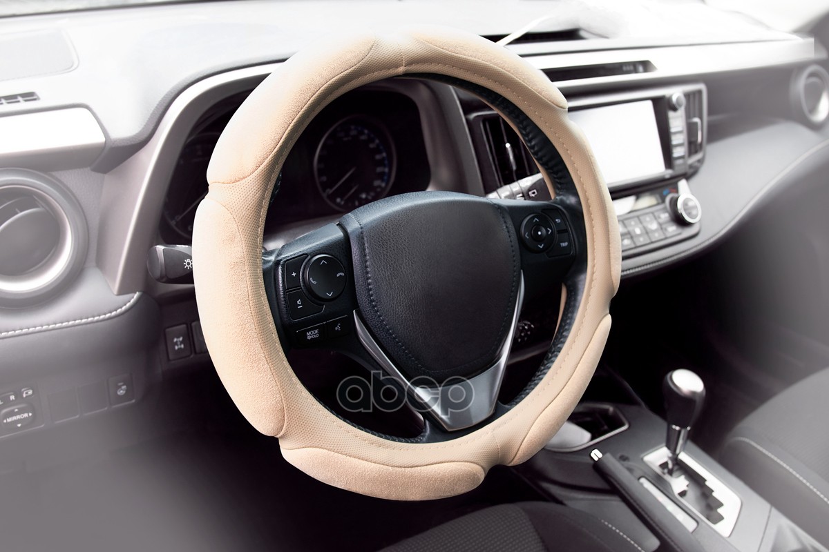 Оплетка на руль, размер "M", 38 см 6 спонжей, Экокожа гладкая со спонжевыми вставками, Бежевая, диаметр 37-39 см