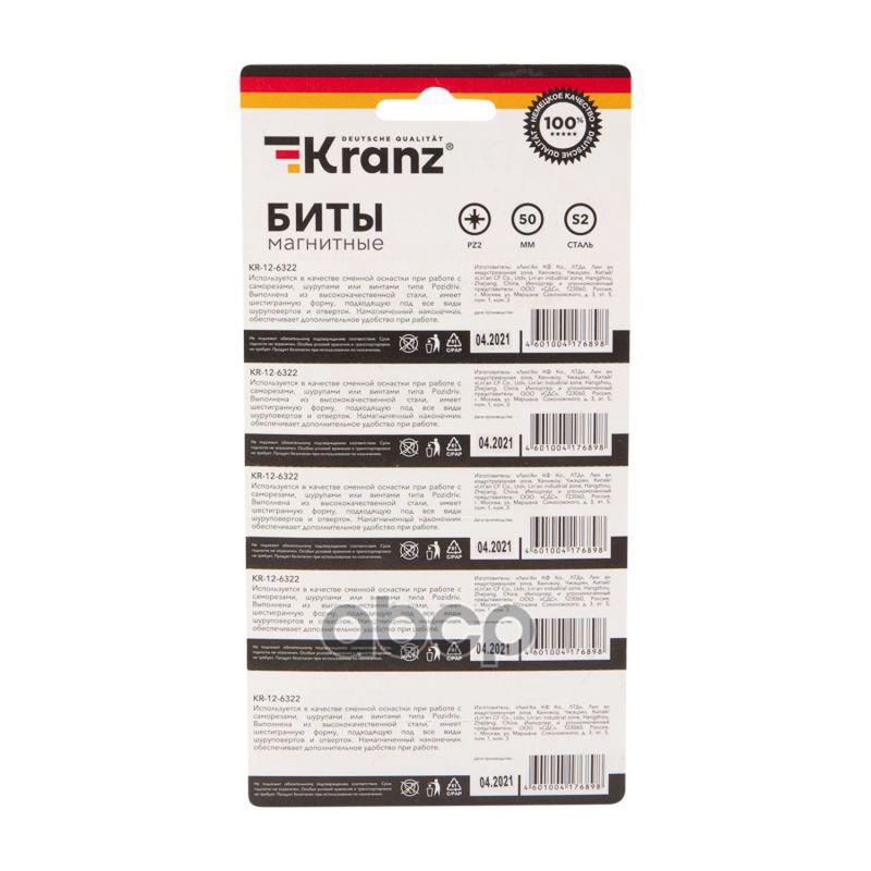 Наименование: Бита вставка PZ2x50мм Kranz для шуруповерта сталь S2 5 шт. (лента) KRANZ