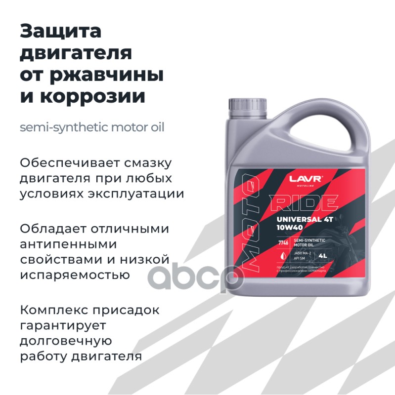 Наименование: Масло Lavr 10/40 MOTO Ride Universal 4T SM 4 л Ln7746 10W40
