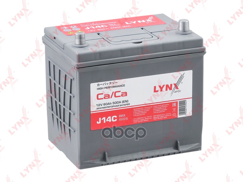 Бренд: LYNXauto, артикул: J14C, Аккумулятор 60 Ah, 500 A, обратная, 230X168X220, JIS 65D23L ACURA/BRILLIANCE/BYD/CHANGAN/CHEVROLET/CITROEN/ENGLON/GEELY/GREAT WALL/HAVAL/HONDA/HYUNDAI/INFINITI/JAC/KIA/LEXUS/MAZDA/MITSUBISHI/NISSAN/OPEL/PEUGEOT/SSANGYONG/SUBARU/SUZUKI/TOYOTA J14;28800-YZZ.