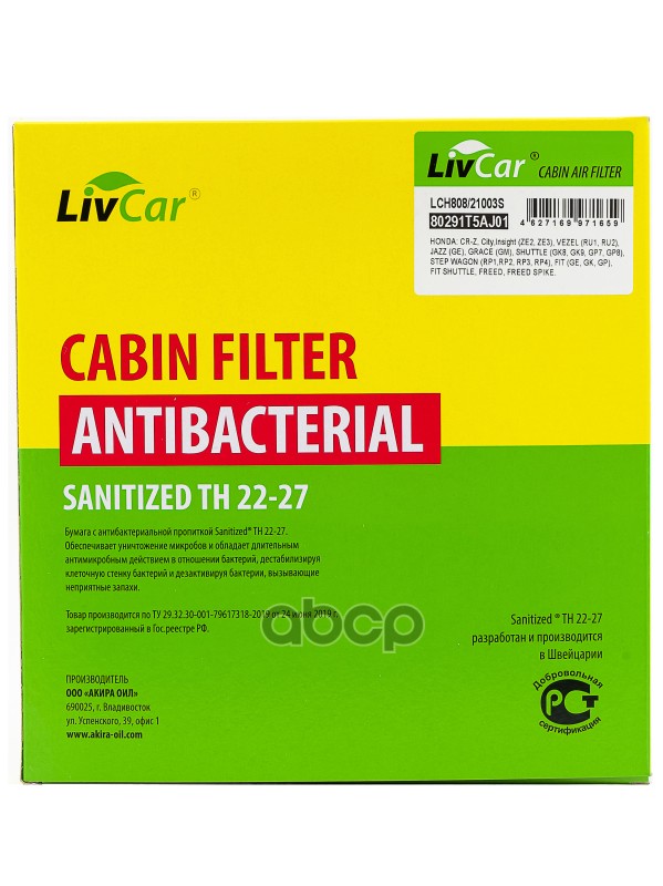 Фильтр салонный антибактериальный LivCar ОЕМ 80291T5AJ01 HONDA (LHD, RHD) HONDA:СR-Z,City,Insight(ZE2,ZE3),VEZEL(RU1,RU2),JAZZ(GE),GRACE(GM),SHUTTLE(GK8,GK9,GP7,GP8),STEPWAGON(RP1,RP2,RP3,RP4),FIT(GE,GK,GP),FITSHUTTLE,FREED,FREEDSPIKE.