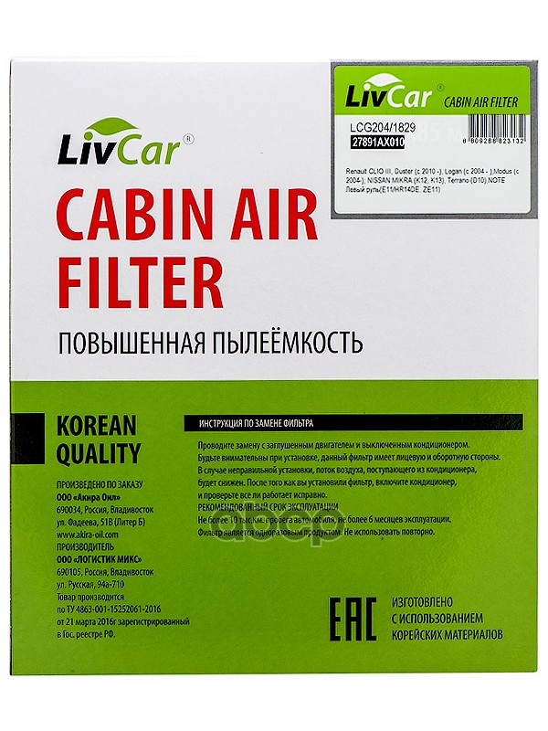 Фильтр салонный LivCar OEM 27891AX010 RENAULT NISSAN (RHD, LHD) RENAULT:CLIOIII,Duster(c2010-),Logan(c2004-),Modus(c2004-) NISSANMIKRA(K12,K13),Terrano(D10),NOTEЛевыйруль(E11/HR14DE,ZE11).