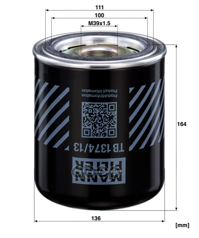 Бренд: MANN-FILTER, артикул: TB137413X, ОСУШИТЕЛЬ ВОЗДУХА, НАВИНЧИВАЕМЫЙ. |