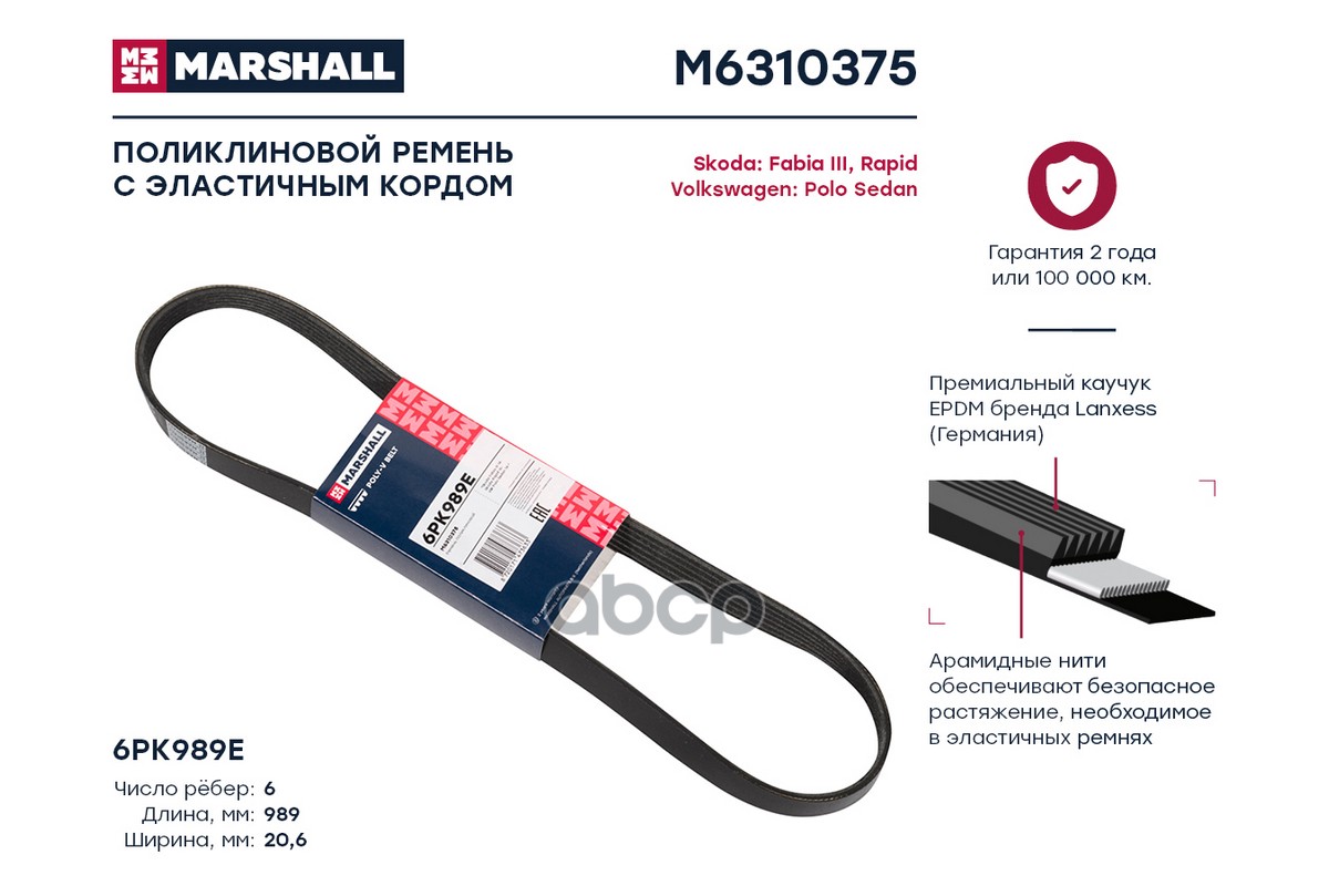 Ремень поликлиновой 6PK989E Skoda Fabia III 14- / Rapid 15- VW Polo Sedan 14- (M6310375)