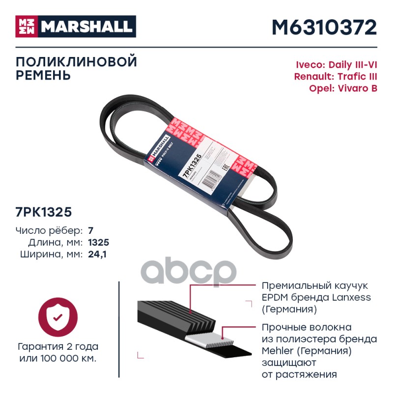 Ремень поликлиновой 7PK1325 Marshall Iveco Daily III-VI 02-; Opel Vivaro B 14-; Renault Trafic III M6310372 4423076;93452889;95517887;504000413;5004000413;5802102050;6000616601;6229930100;316300100802001;021145933J;117201261R;A6229930100;34337;37934337;50