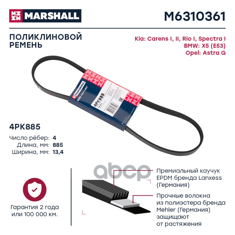 Ремень поликлиновой 4PK885 Kia Carens I, II 99- / Rio I 00- / Spectra I 00- BMW X5 (E53) 00- (M6310
