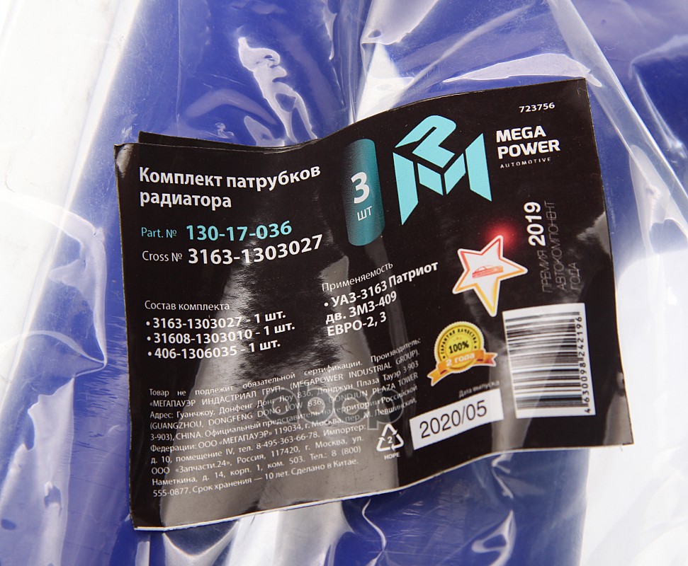 MEGAPOWER Automotive 13017036 Бренд: MEGAPOWER Automotive, артикул: 130-17-036, Патрубок УАЗ-3163 Патриот дв.ЗМЗ-409 ЕВРО-2,3 радиатора комплект 3шт. синий силикон MEGAPOWER.