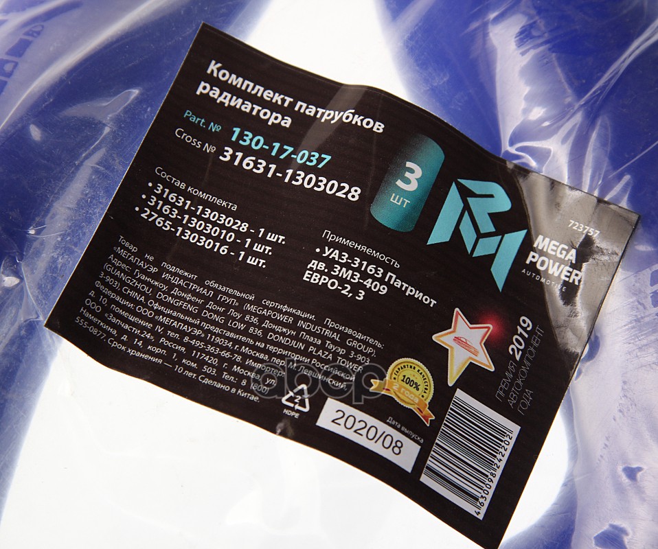 Бренд: MEGAPOWER Automotive, артикул: 130-17-037, Патрубок УАЗ-3163 Патриот дв.ЗМЗ-409 ЕВРО-2,3 радиатора с кондицион. комп.3шт.син.силикон MEGAPOWER. |