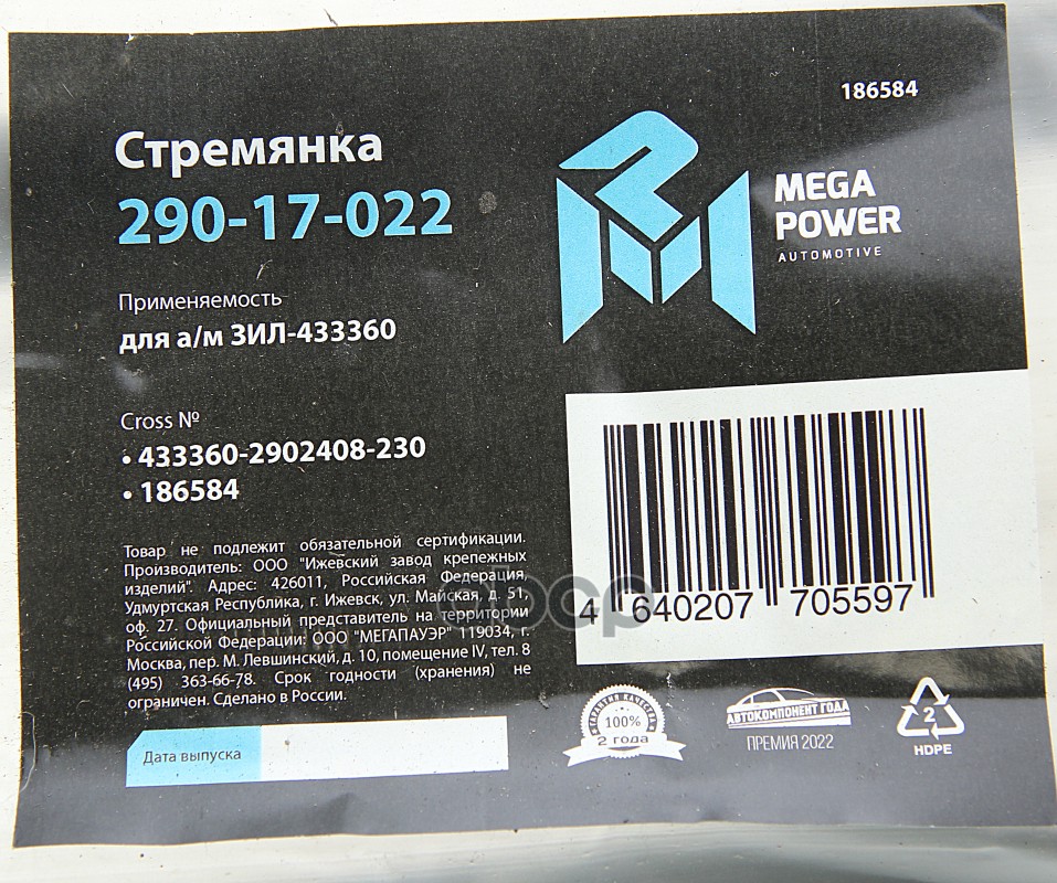 Бренд: MEGAPOWER Automotive, артикул: 29017022, СТРЕМЯНКА ЗИЛ-433360 РЕССОРЫ ПЕРЕДНЕЙ L 230ММM20X1. |