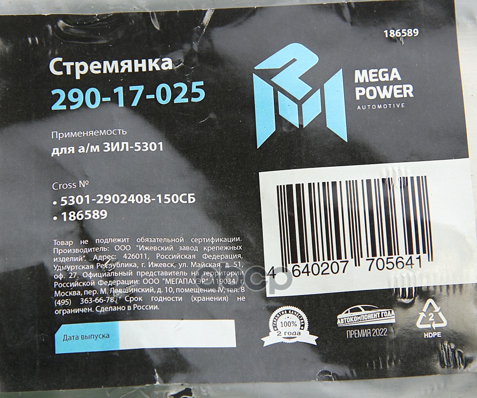 MEGAPOWER Automotive 29017025 Бренд: MEGAPOWER Automotive, артикул: 29017025, СТРЕМЯНКА ЗИЛ-5301 РЕССОРЫ ПЕРЕДНЕЙ L 150МММ16Х1.5.