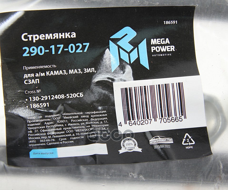 Наименование: Стремянка КАМАЗ,МАЗ,ЗИЛ,СЗАП рессоры задней L=520мм;М22х1.5мм узкой кованая в сборе MEGAPOWER