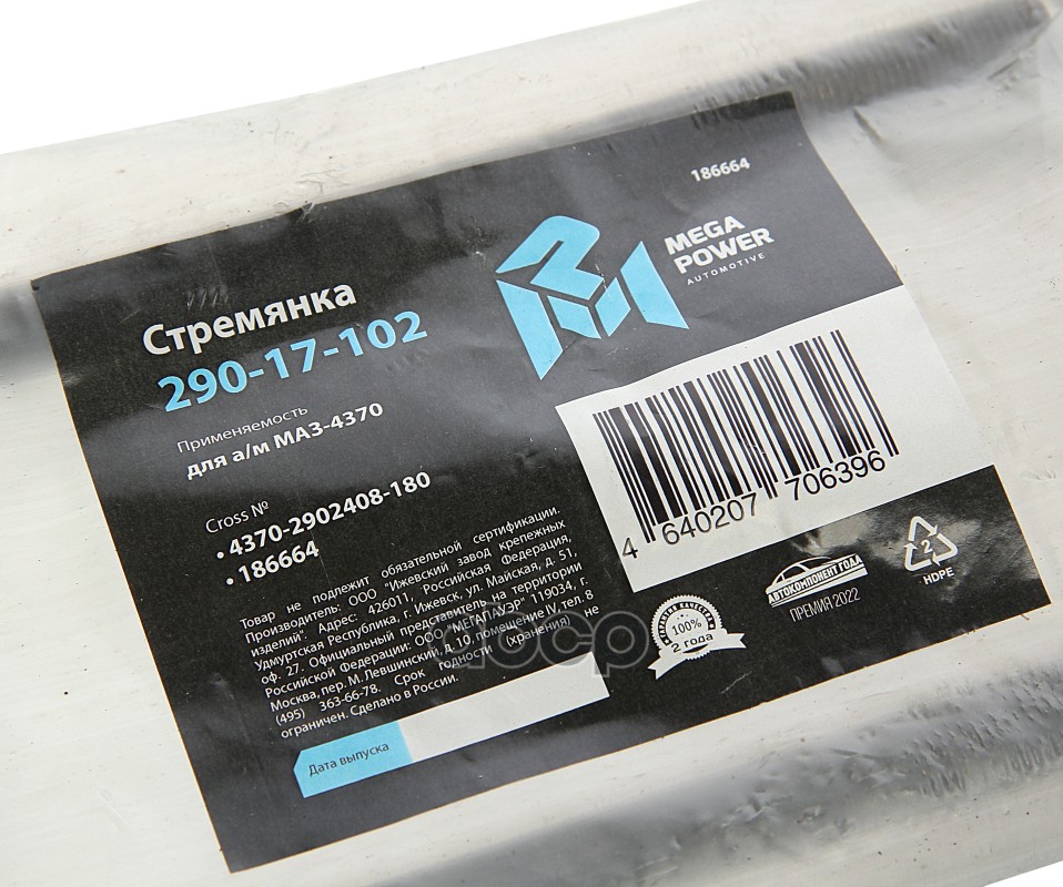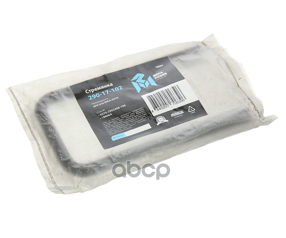 Бренд: MEGAPOWER Automotive, артикул: 29017102, СТРЕМЯНКА МАЗ-4370 РЕССОРЫ ПЕРЕДНЕЙ L 180МММ14Х1.5. |