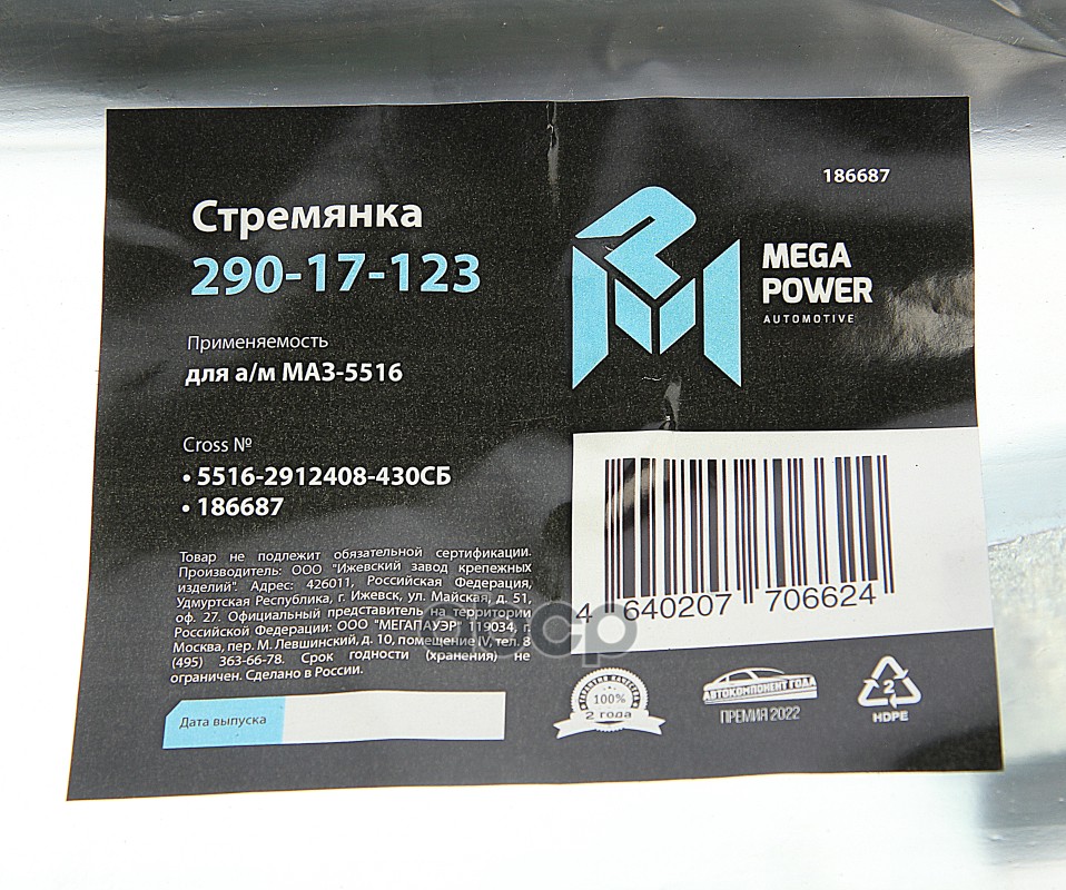 Бренд: MEGAPOWER Automotive, артикул: 290-17-123, Стремянка МАЗ-5516 рессоры задней L=430мм;М30х2мм кованая в сборе MEGAPOWER. |
