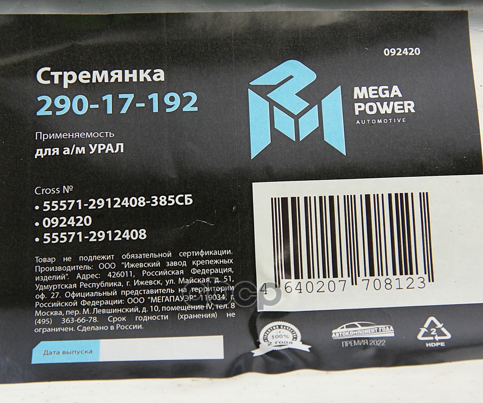 Бренд: MEGAPOWER Automotive, артикул: 290-17-192, Стремянка УРАЛ рессоры задней L=385мм;М27х2мм усиленная в сборе MEGAPOWER. |