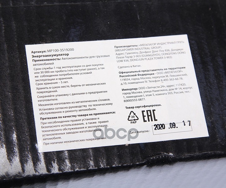 Наименование: Энергоаккумулятор ЗИЛ,МАЗ,КАМАЗ,КРАЗ с чехлом MEGAPOWER