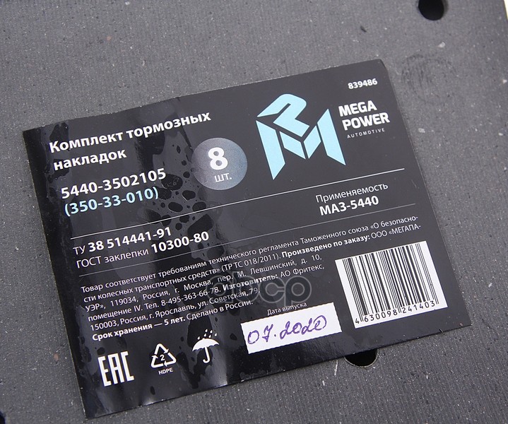 Бренд: MEGAPOWER Automotive, артикул: 35033010, НАКЛАДКА ТОРМОЗНОЙ КОЛОДКИ МАЗ-5440 ЗАДНЕЙ СВЕРЛЕН. |