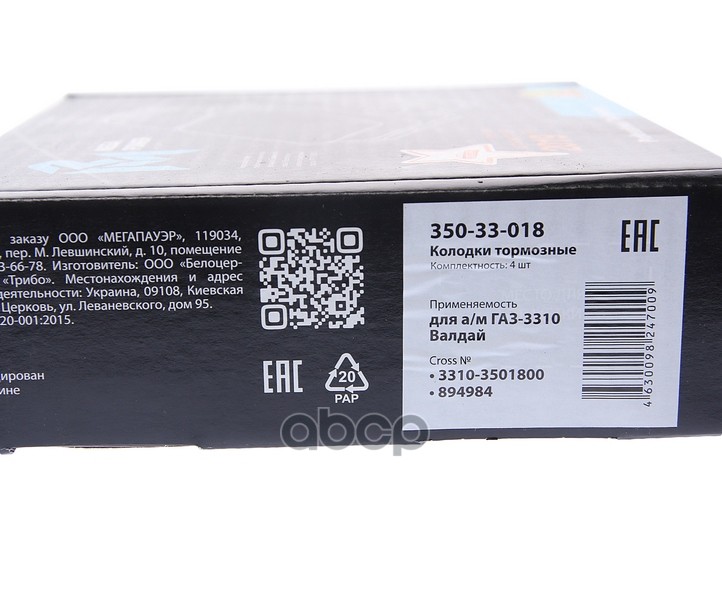 Бренд: MEGAPOWER Automotive, артикул: 350-33-018, Колодки тормозные ГАЗ-3310 Валдай передние/задние с ремкомплектом (4шт.) MEGAPOWER. |
