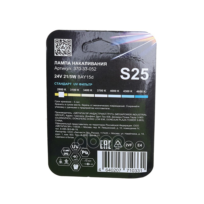 Бренд: MEGAPOWER Automotive, артикул: 370-33-052, Лампа 24V P21/5W BAY15d блистер (2шт.) Standart MEGAPOWER. |