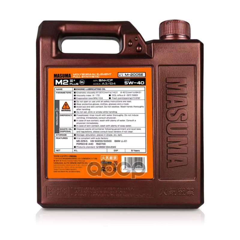 Наименование: Масло моторное "MASUMA" M-2005E / 5W40 M2 SN+ / CF / A3B4 (универсальное, синтетика) 4л
