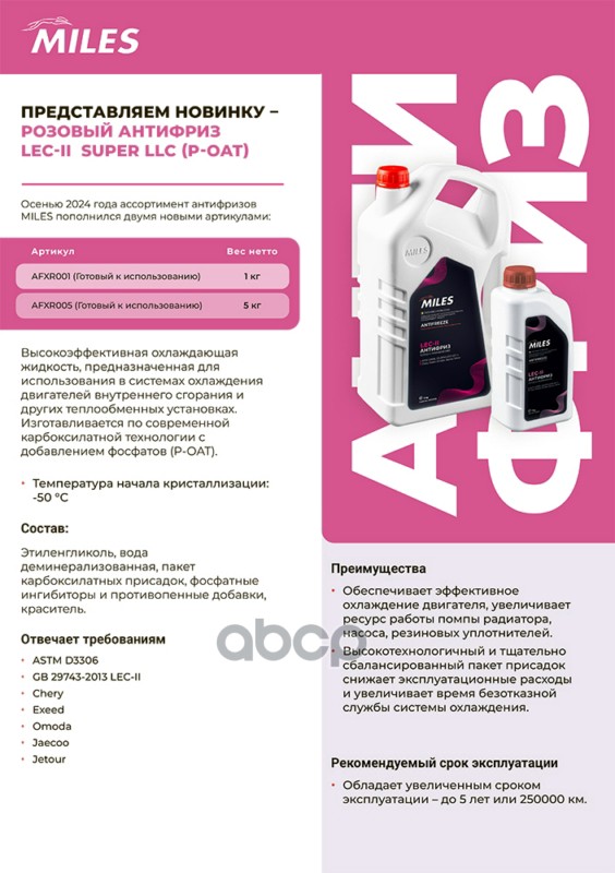 Наименование: Антифриз готовый к применению (розовый) Chery,Exeed,Omoda,Jaecoo,Jetour LEC-II SUPER LLC (P-OAT) -50 °C 5 кг AFXR005