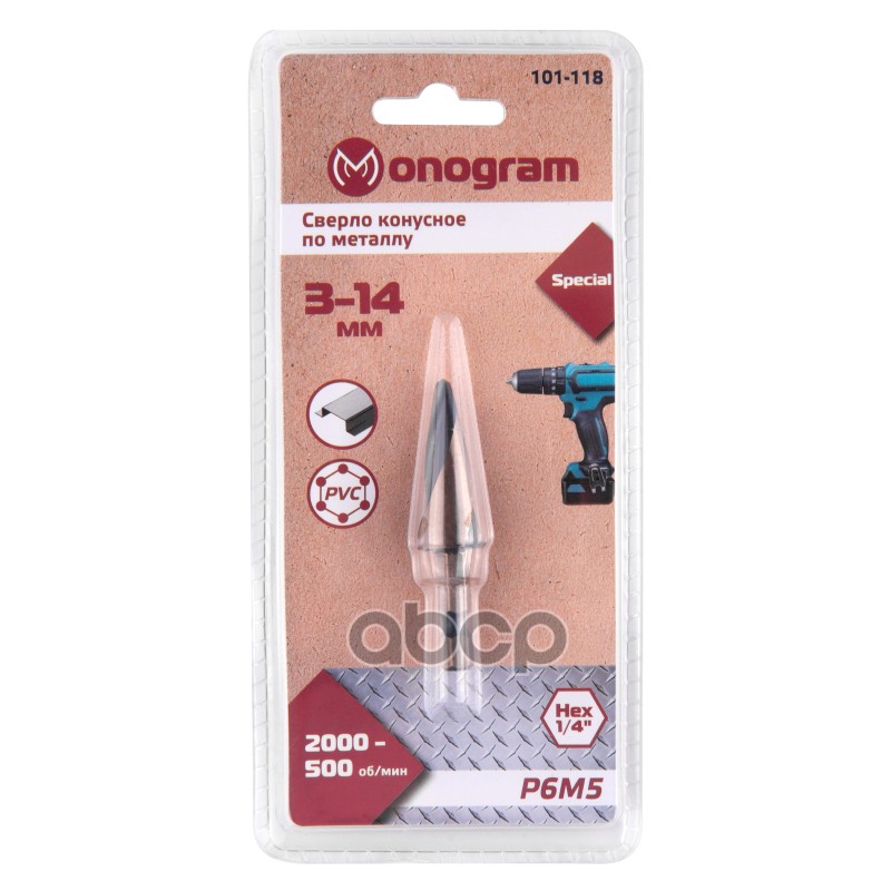 Бренд: Monogram, артикул: 101118, Сверло конусное по мет. витое 3-14 мм, Р6М5, Hex 14. |