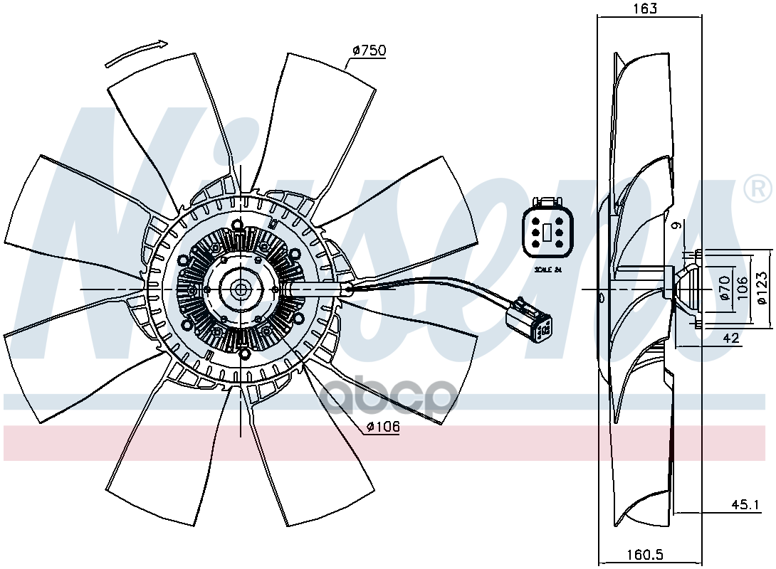 Вискомуфта для автомобилей Scania с крыльчаткой D=750 8 лопастей, разъем 6 PIN