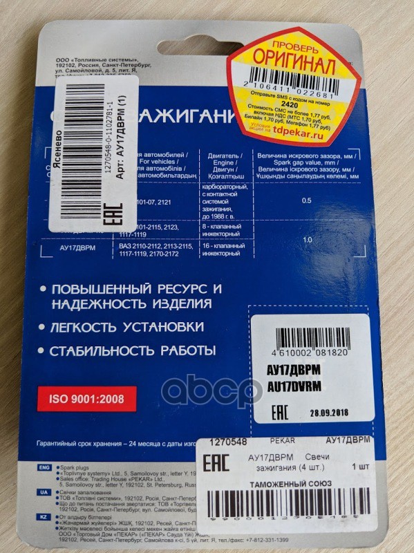 Наименование: Свеча зажигания ВАЗ-2112 16 кл.АУ-17ДВРМ мед.эл. с рез-м (ком-т 4 шт.) Пекар