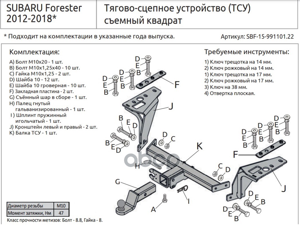 Фаркоп Subaru Forester 2013-2018 съемное крепление шара под американский квадрат