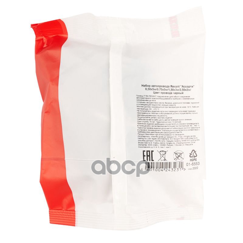 Наименование: Провод ПГВА набор Ассорти 0,50х5 м/0,75х5 м/1,50х3 м/2,50х2 м черный Rexant 01-6553