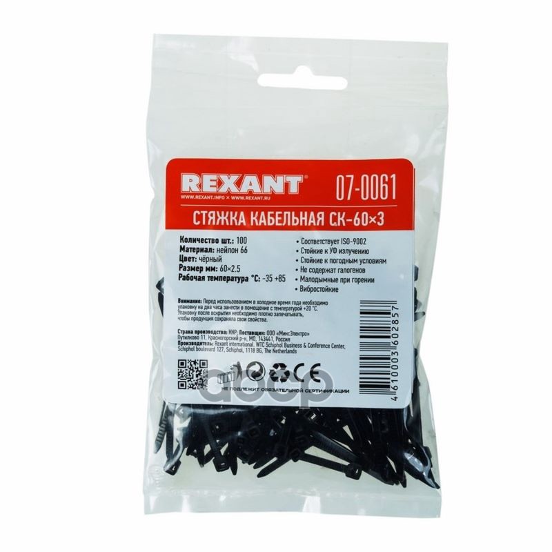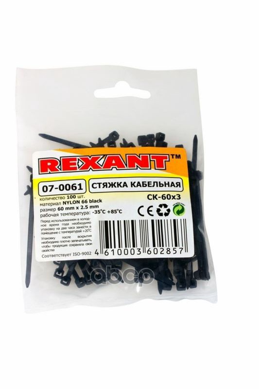 Бренд: REXANT, артикул: 070061, Хомуты-стяжки 60х2.5 мм REXANT кабельные нейлон (пластик) Черные min100.
